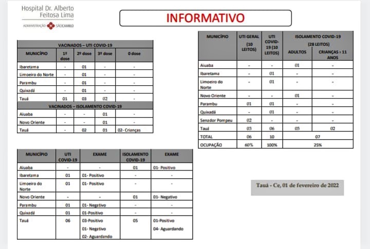 A taxa de ocupação de leitos de UTI-Covid no Hospital Dr. Alberto Feitosa Lima continua em 100%, sendo 60% de pacientes de Tauá internados.