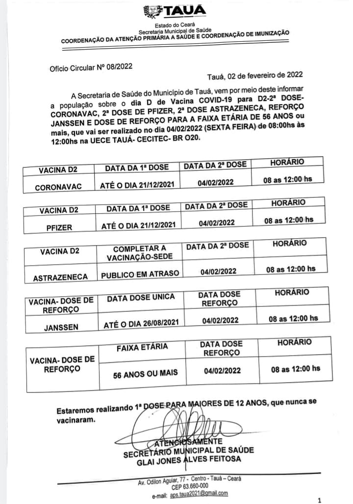 Mais um Dia D de vacinação contra a Covid-19 será realizado pela Secretaria de Saúde do município de Tauá na sexta-feira (04), para respescagem, aplicação de D2 e dose de reforço para faixa etária a partir de 56 anos.