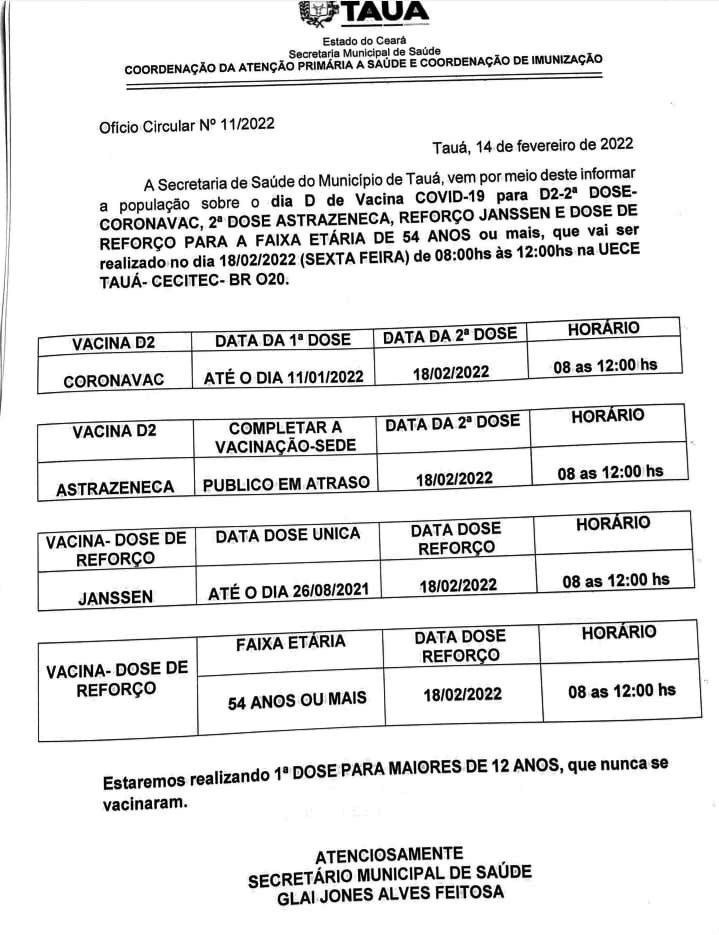 Mais um Dia D de vacinação contra a Covid acontecerá em Tauá, na próxima sexta-feira (18), no Centro de Educação Ciências e Tecnologia (CECITEC), às margens da BR-020, no horário de 8h às 12h, para as pessoas da Sede do Município.