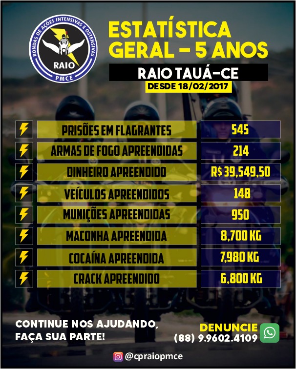 O CPRaio comemora hoje (18), cinco anos de implantação da Companhia situada no município de Tauá, com um balanço extramamente positivo do trabalho realizado no combate a criminalidade em geral, tráfico de drogas e na garantia de mais segurança para a população.
