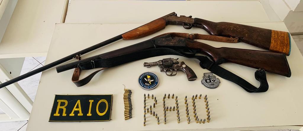 Ao chegarem na residência do suspeito, a composição encontrou a esposa dele que autorizou a entrada dos policiais. Na casa havia uma moto que logo foi averiguada mas nenhuma restrição foi encontrada, no entanto, um dos policiais avistou algumas munições sobre um móvel e eles resolveram fazer uma busca, encontrando uma espingarda calibre 12 e outra calibre 16, um revólver calibre 22, além de 88 munições calibre 22.