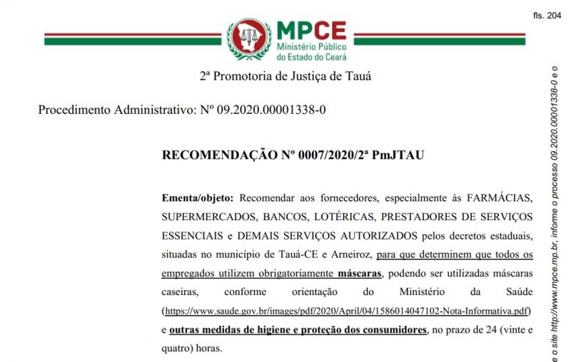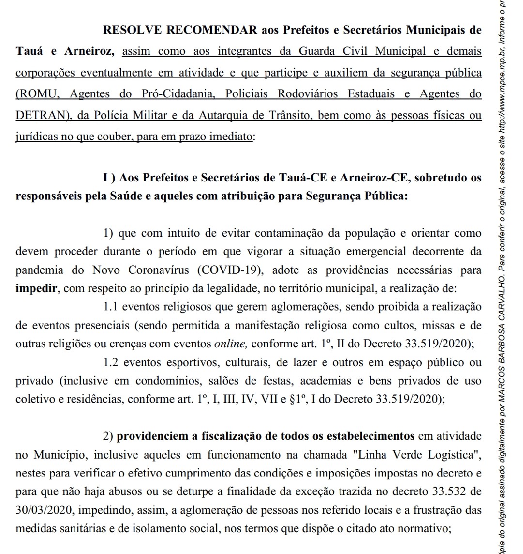 O Ministério Público emitiu Recomendação aos prefeitos e secretários municipais de Tauá e Arneiroz que impeçam realização de eventos religiosos, esportivos, culturais e residenciais com o objetivo evitar aglomerações.