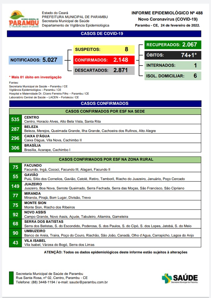 A Secretaria de Saúde confirmou mais um óbito por Covid no município de Parambu.