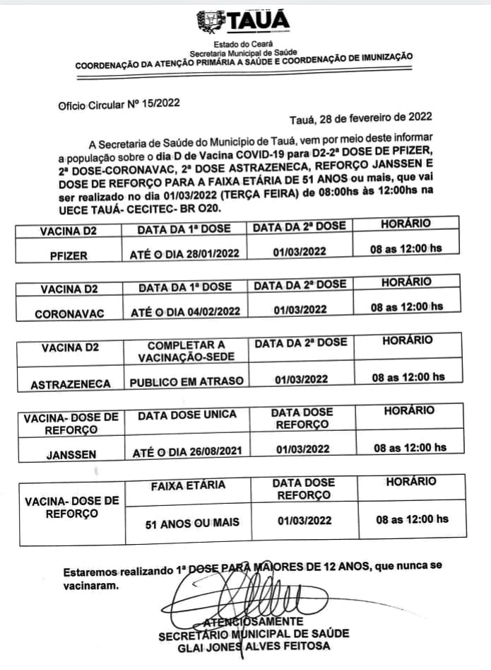 A Secretaria de Saúde do município de Tauá realizar nesta terça-feira, 1º de março, mais um Dia D para aplicação de quatro tipos de vacinas contra a Covid-19.