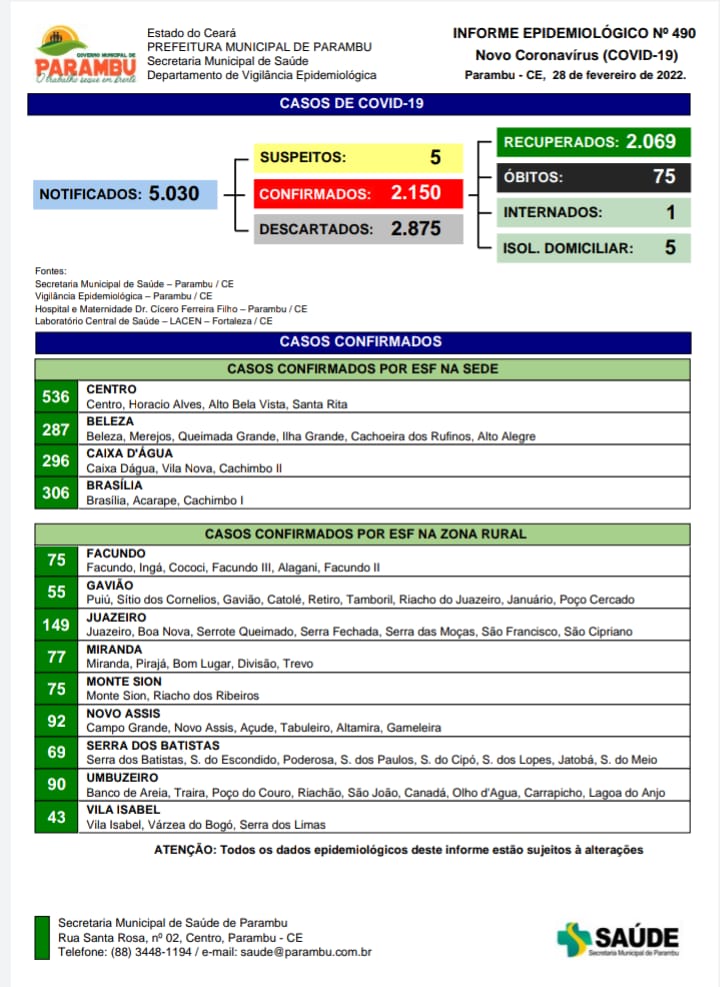A Secretaria de Saúde do Município de Parambu confirmou hoje (28), o sexto óbito provocado pelo Coronavíris nesse ano de 2022. A morte ocorreu há vários dias e estava sendo investigada.