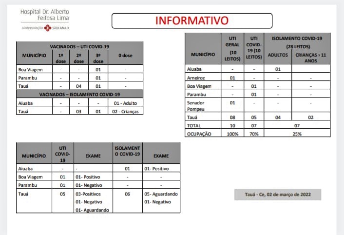 O Hospital Dr. Alberto Feitosa Lima informou que a taxa de ocupação de leitos de UTI-Geral permanece em 100% e na UTI-Covid houve redução de 80% para 70%. A Enfermaria-Covid está com 25% dos leitos ocupados.