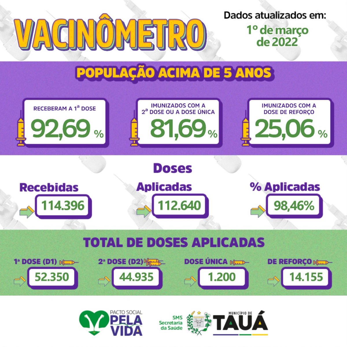 Ontem(01), foram atualizados os números do vacinômetro em Tauá. O Município recebeu até agora 114.936 doses de vacinas e foram aplicadas 112.640 (98,46%.