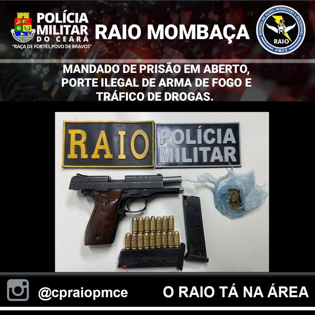 Uma operação conjunta do CPRaio e do POG de Mombaça, prendeu na noite de ontem (02), na cidade de Pedra Branca, um homem identificado como Paulo Leandro de Lima Souza, vulgo Boião, acusado de tráfico de drogas e porte ilegal de arma de fogo.