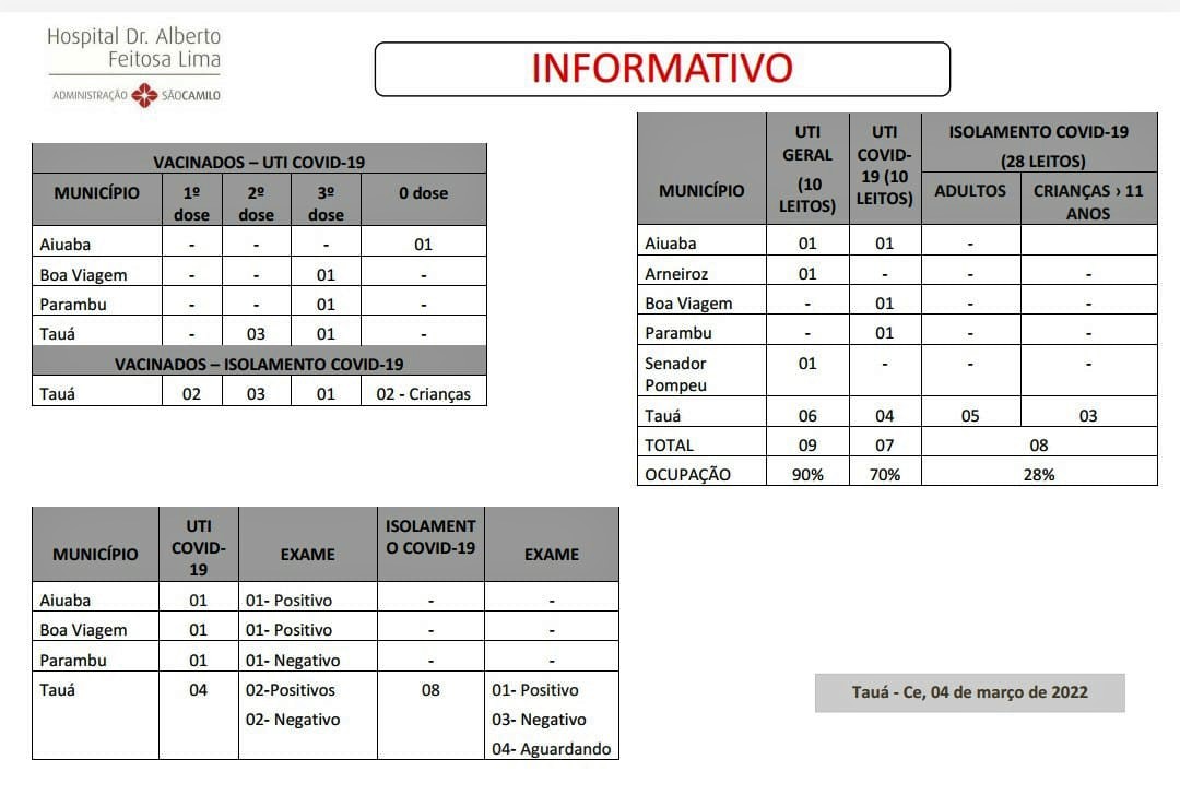 O Boletim Epidemiológico divulgado na noite de hoje (04), pela Secretaria de Saúde aponta nova redução de pessoas infectadas pela Covid-19, no Município de Tauá.