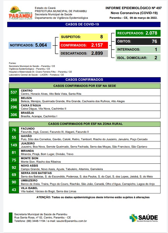 O Boletim Epidemiológico aponta que desde o início da pandemia, 76 pessoas morreram em Parambu. Em 2022, foram sete mortes registradas.