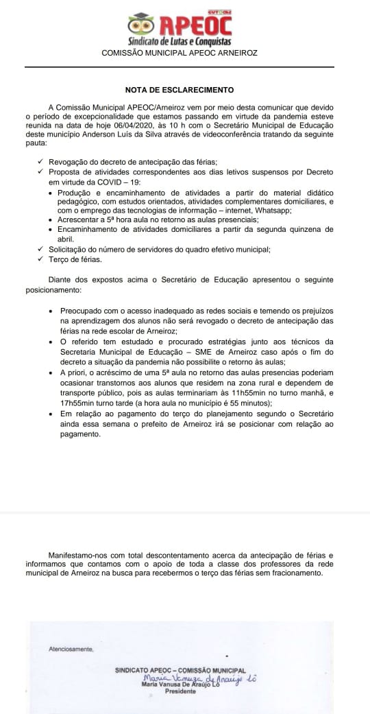 A presidente de do núcleo local do Sindicato Apeoc, Vanusa Lê, encaminhou nota ao Blog do Wilrismar relatando que local pediu a revogação da medida durante vídeo conferência com o Secretário de Educação do município, além de outras reivindicações, com o pagamento do terço das férias dos professores sem parcelamento.