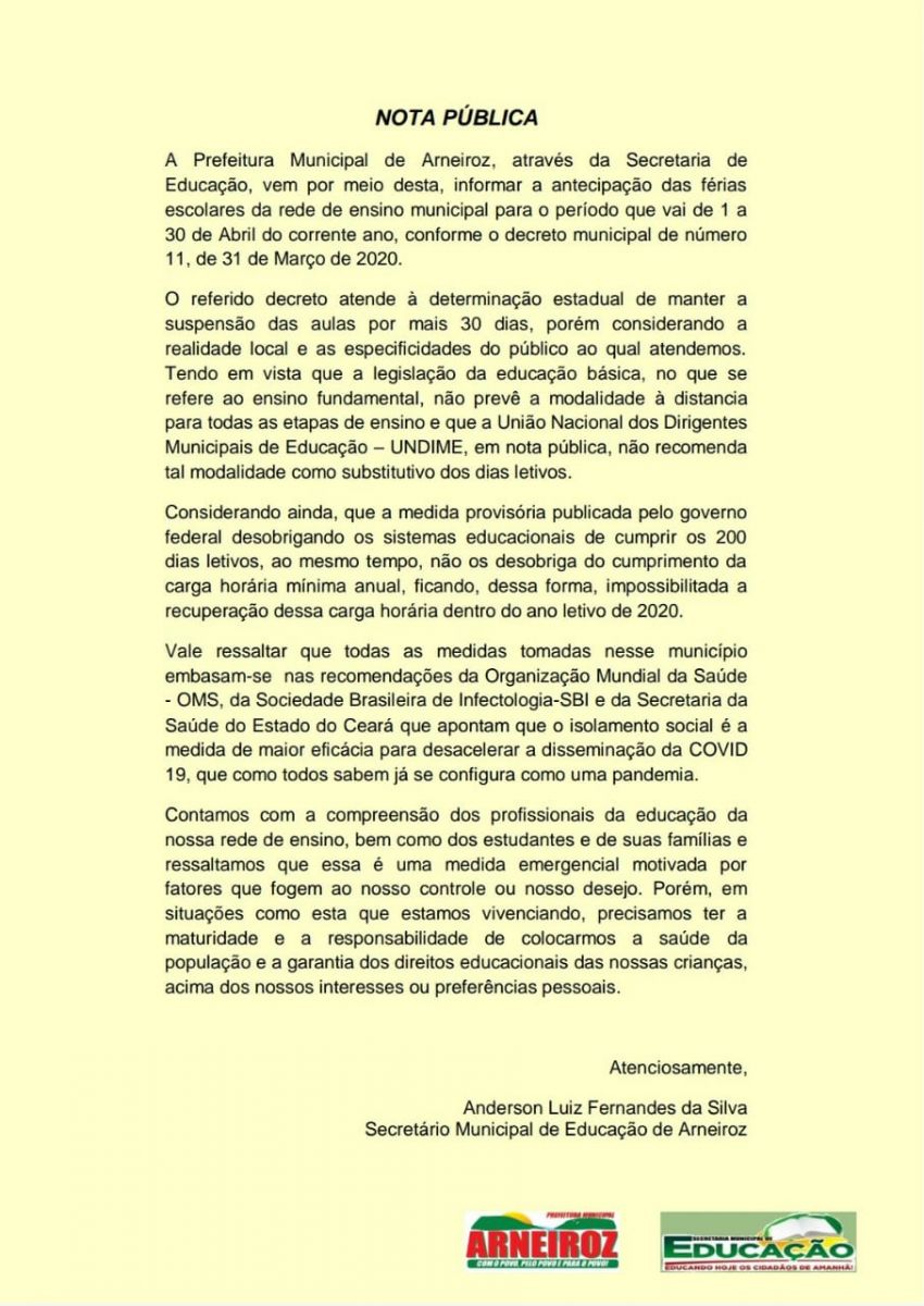A antecipação das férias escolares para o mês de abril na rede municipal de ensino de Arneiroz gerou polêmica.