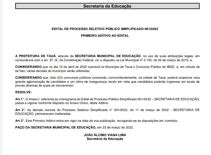 A prova escrita da seleção da Educação de Tauá que estava marcada para o dia 10 de abril, foi adiada para o dia 24. Já a prova de títulos foi remarcada para o dia 05 de maio e o resultado final será divulgado no dia 13 de maio.