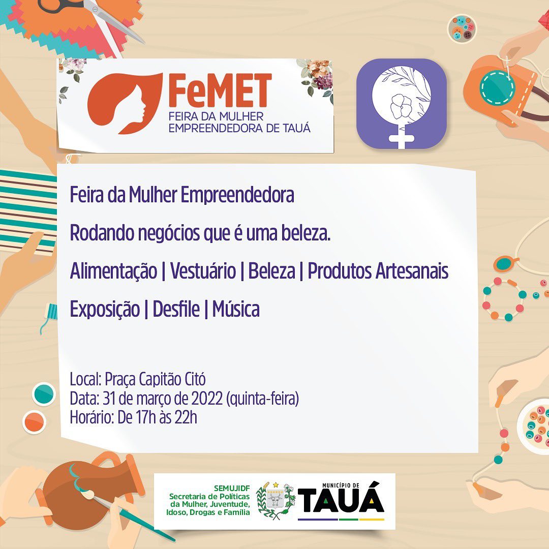 A Prefeitura de Tauá por meio da Secretaria de Políticas da Mulher, Juventude, Idoso, Drogas e Família, e a Fundação de Desenvolvimento Econômico, realiza nesta quinta-feira (31), a 1ª FeMet, Feira de Mulher Empreendedora.