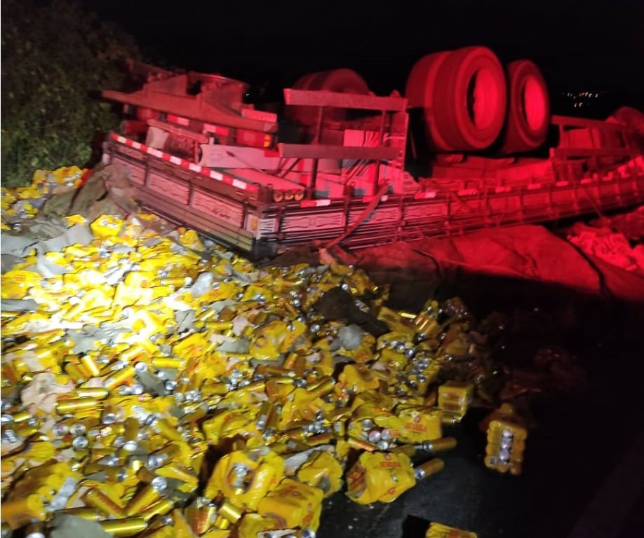 A carga ficou espalhada pelo meio da pista e a Polícia Militar foi acionada.