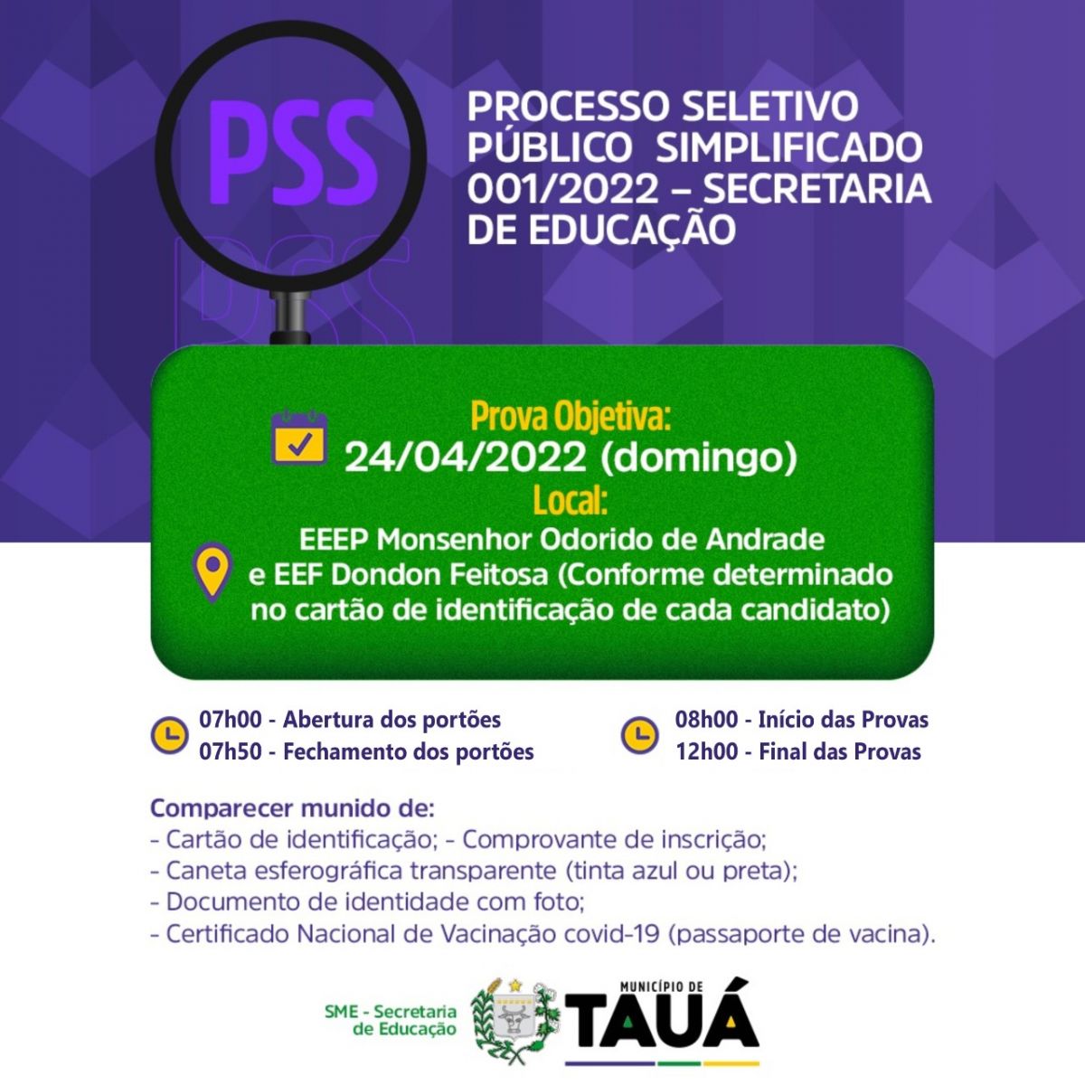 A primeira etapa do Processo Seletivo da Secretaria de Educação do Município de Tauá acontecerá no domingo (24), nas Escolas, Monsenhor Odorico e Dondon Feitosa.