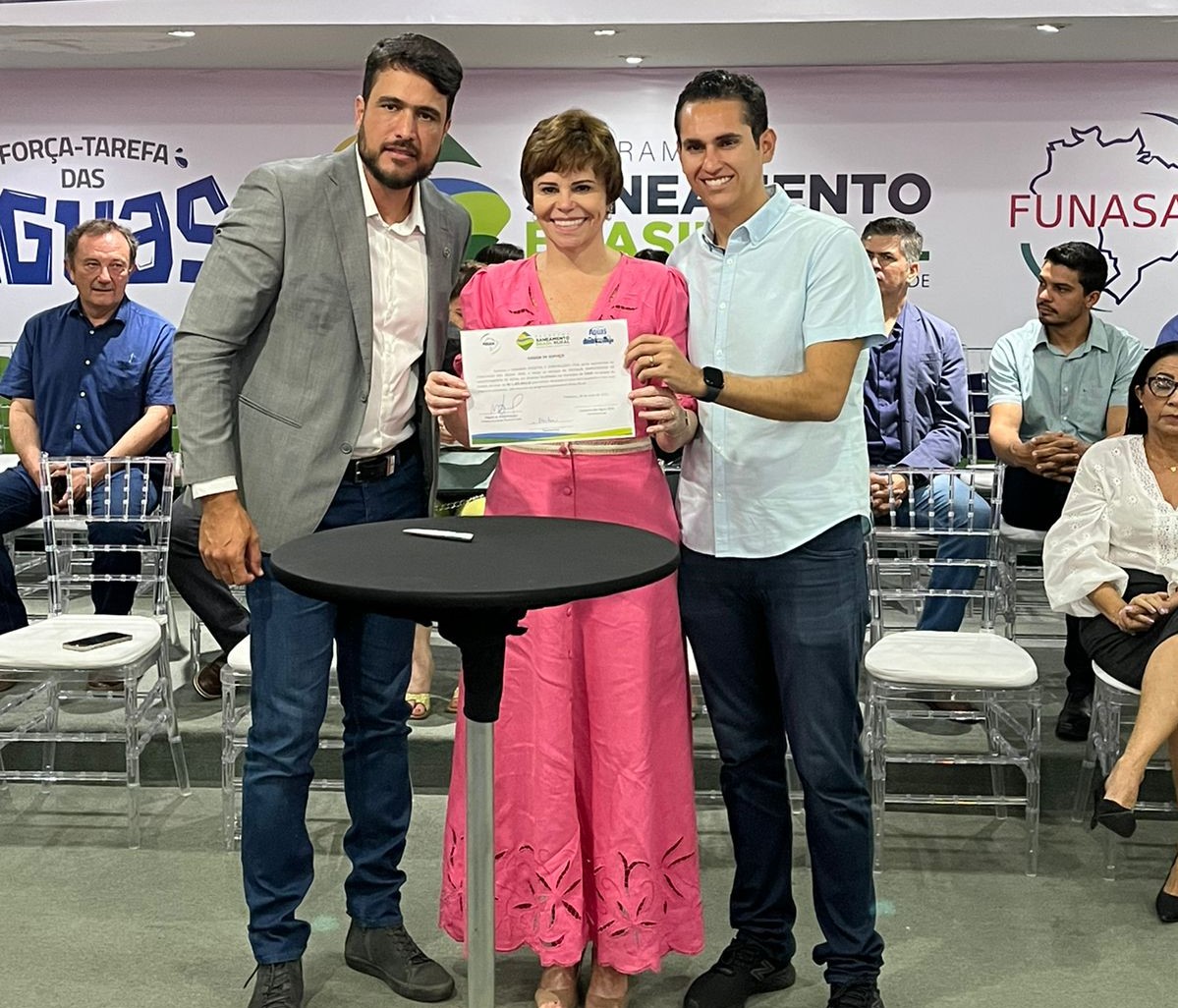 A Prefeita Patrícia Aguiar assinou ordem de serviço para instalação de sistemas de abastecimento de água em Tauá, ao lado do presidente da Funasa, Miguel Marques, e do deputado federal Domingos Neto.