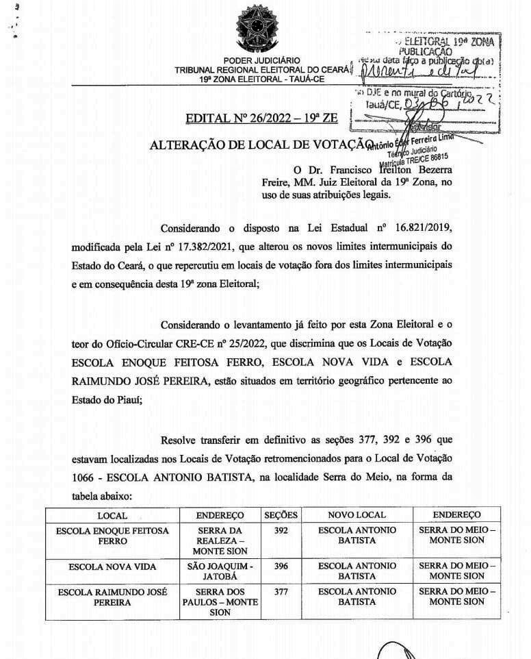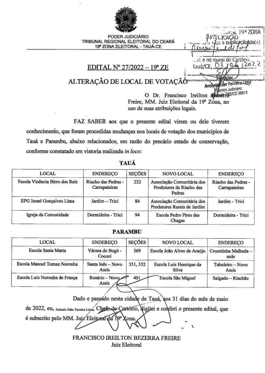 A Justiça Eleitoral da 19ª zona alterou locais de votação para as eleições gerais de 2022, nos municípios de Tauá e Parambu.