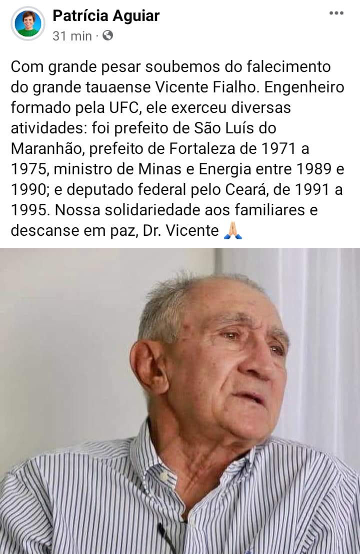 Faleceu na noite de ontem (11), na UTI do Hospital São Carlos, em Fortaleza, o tauaense ex-ministro Vicente Cavalcante Fialho, 84 anos. Ele estava internado há vários dias com problemas cardíacos que se agravaram evoluindo para o óbito.