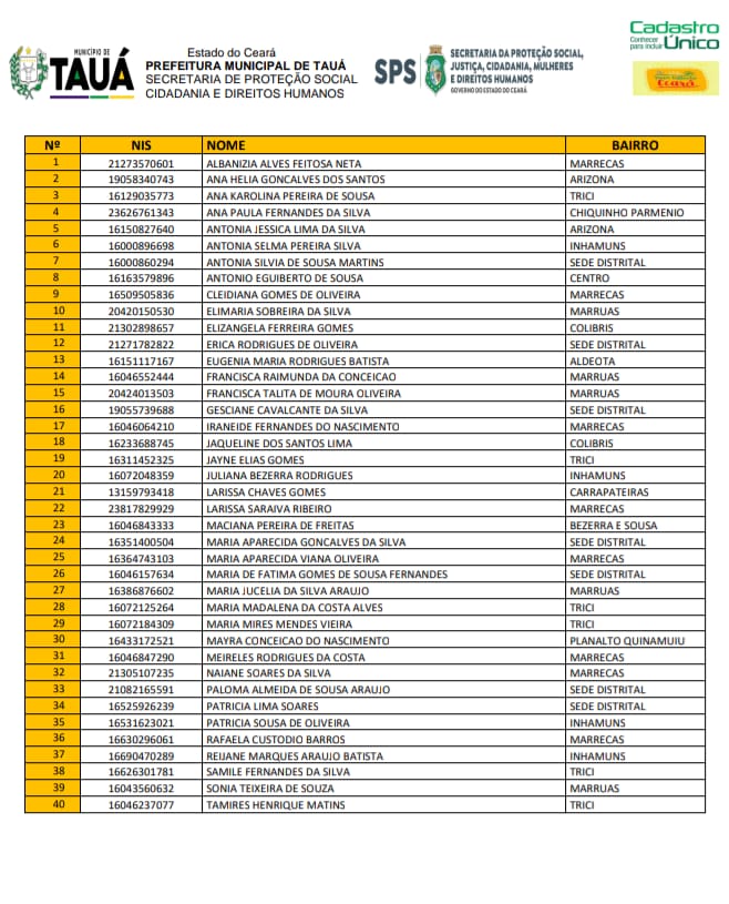 Mais 40 famílias fora incluídas no Programa Mais Infância Ceará no município de Tauá. A lista foi divulgada hoje (19), pela Secretaria de Proteção Social da Prefeitura.