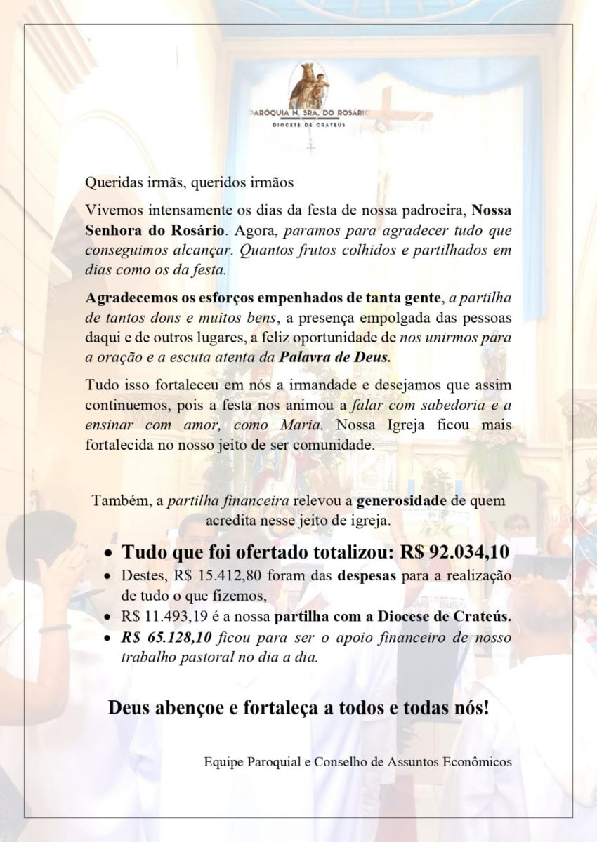 A Paróquia de Tauá divulgou na manhã de hoje (22), o balanço financeiro da Festa da Padroeira Nossa Senhora do Rosário, realizada entre os dias, 07 e 16 de outubro.