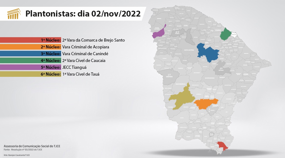 Nos Núcleos Regionais de Custódia e de Inquéritos em que há juiz Auxiliar Privativo, duas unidades entrarão em plantão. Dessa forma, no caso do 1º Núcleo, a 2ª Vara da Comarca de Brejo Santo terá a companhia da Vara Única de Campos Sales. Já no 4º Núcleo, a 2ª Vara Cível de Caucaia trabalhará ao lado da 3ª Vara Cível de Caucaia e, no 5º Núcleo, o JECC Tianguá unirá forças à Vara Única de Ubajara.