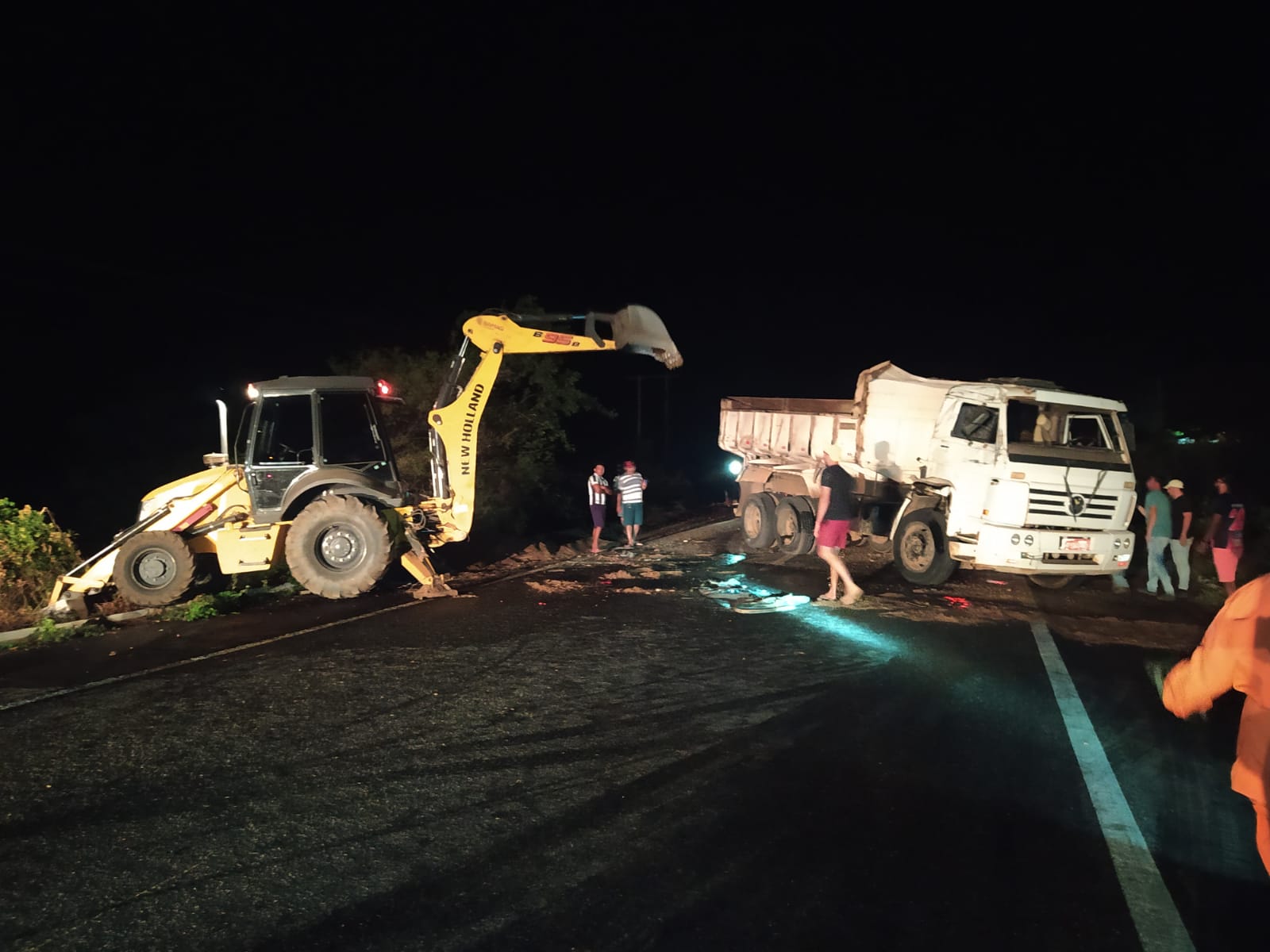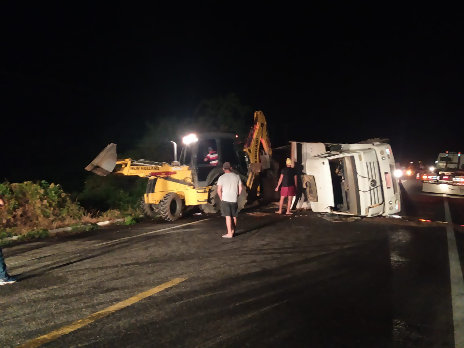 Equipes do Corpo de Bombeiros, AMT e PRF, com o auxílio de uma retroescavadeira e um guincho, conseguiram desvirar a caçamba e trabalham para retirar o material e o óleo espalhados na pista, para que o tráfego seja liberado nas próximas horas.