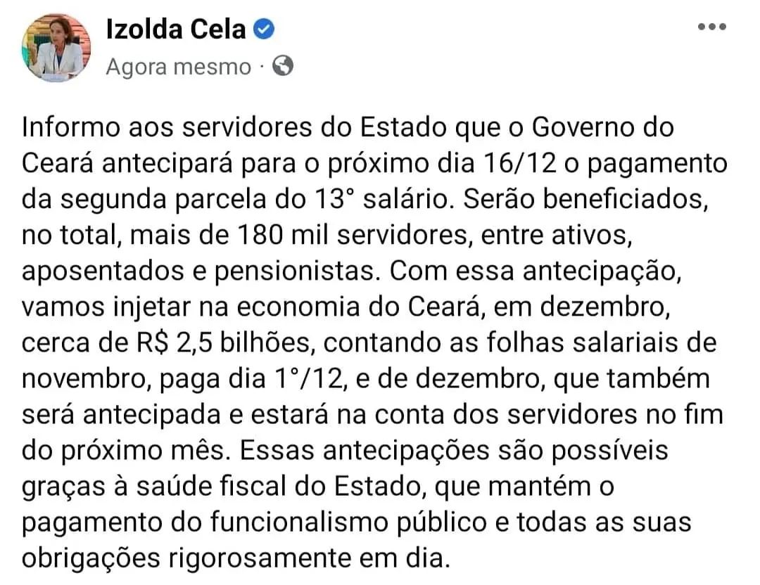 A segunda parcela do 13º salário dos servidores estaduais do Ceará será antecipada. A governadora Izolda Cela (sem partido) anunciou, nesta terça-feira (29), que o benefício será pago no 16 de dezembro. A lei determina que o pagamento deve acontecer até 20 de dezembro.