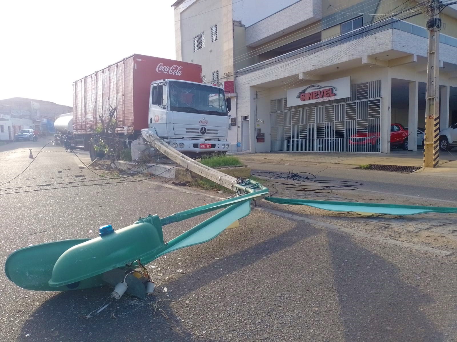 O veículo transportava uma carga de refrigerantes para uma distribuidora da cidade quando colidiu e derrubou um poste no canteiro central da rua.
