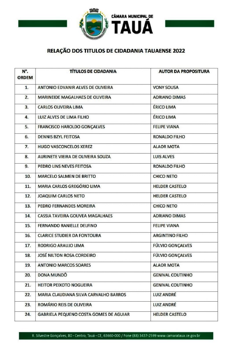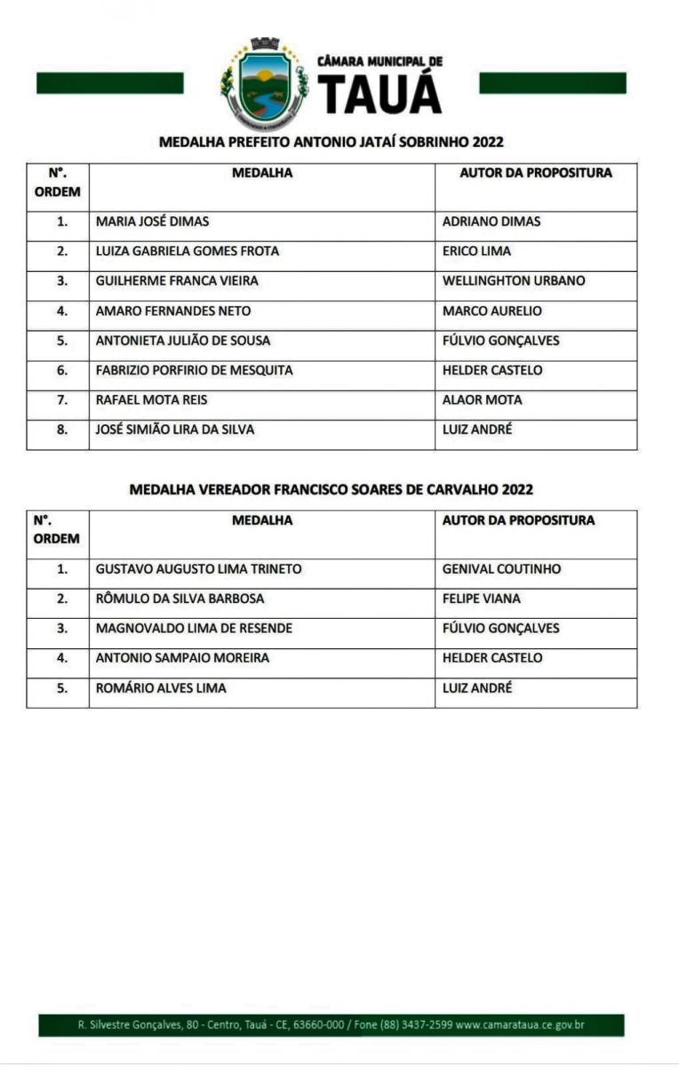 A solenidade acontecerá no plenário da Câmara. Serão entregues 37 honrarias, sendo 24 Títulos de Cidadania Tauaense, 8 Medalhas Prefeito Antonio Jataí Sobrinho e 5 Medalhas Francisco Soares de Carvalho.