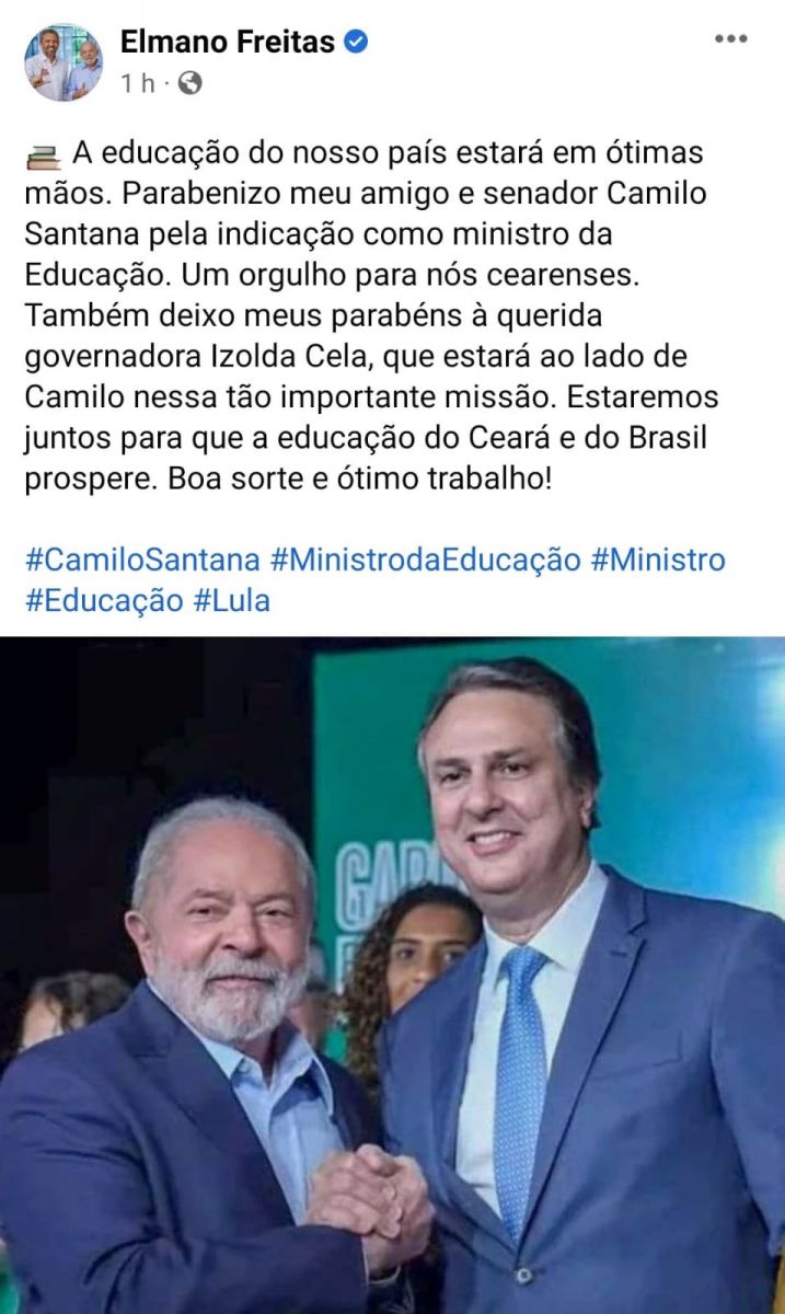 O governador eleito do Ceará, Elmano de Freitas (PT), comemorou nas rede sociais a oficialização do ex-governador Camilo Santana (PT) como ministro do Ministério da Educação (MEC) no futuro Governo Lula nesta quinta-feira (22).