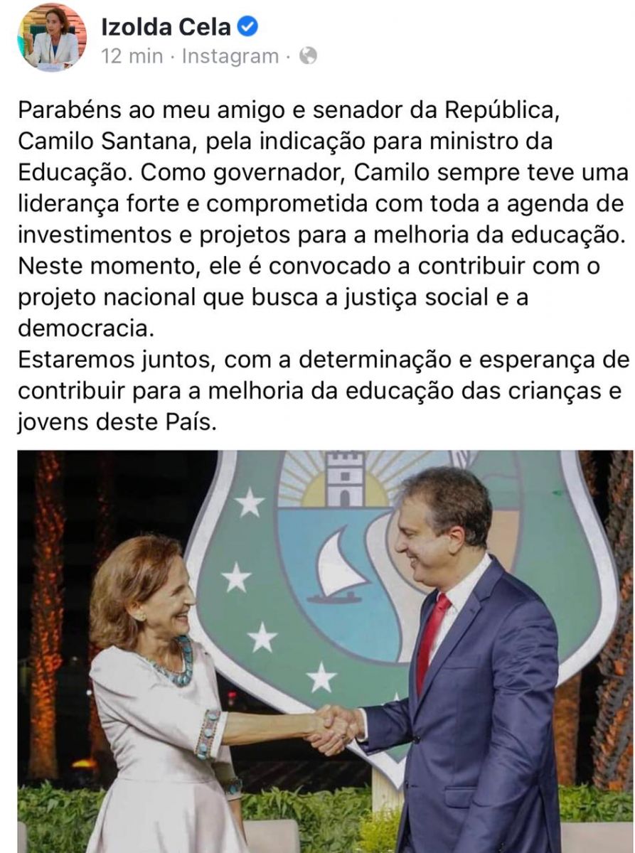 "Também deixo meus parabéns à querida governadora Izolda Cela, que estará ao lado de Camilo nessa tão importante missão. Estaremos juntos para que a educação do Ceará e do Brasil prospere", ressaltou.
