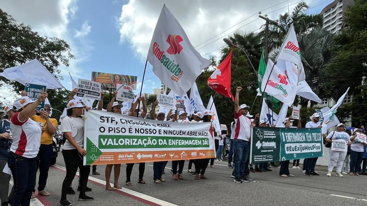 Um grupo de enfermeiros, técnicos e auxiliares de enfermagem e parteiras protestou nesta quarta-feira (4) contra a manutenção da liminar no Supremo Tribunal Federal (STF) que suspende o pagamento do piso salarial da enfermagem. O ato aconteceu em frente ao prédio do Tribunal Regional do Trabalho (TRT), em Fortaleza.