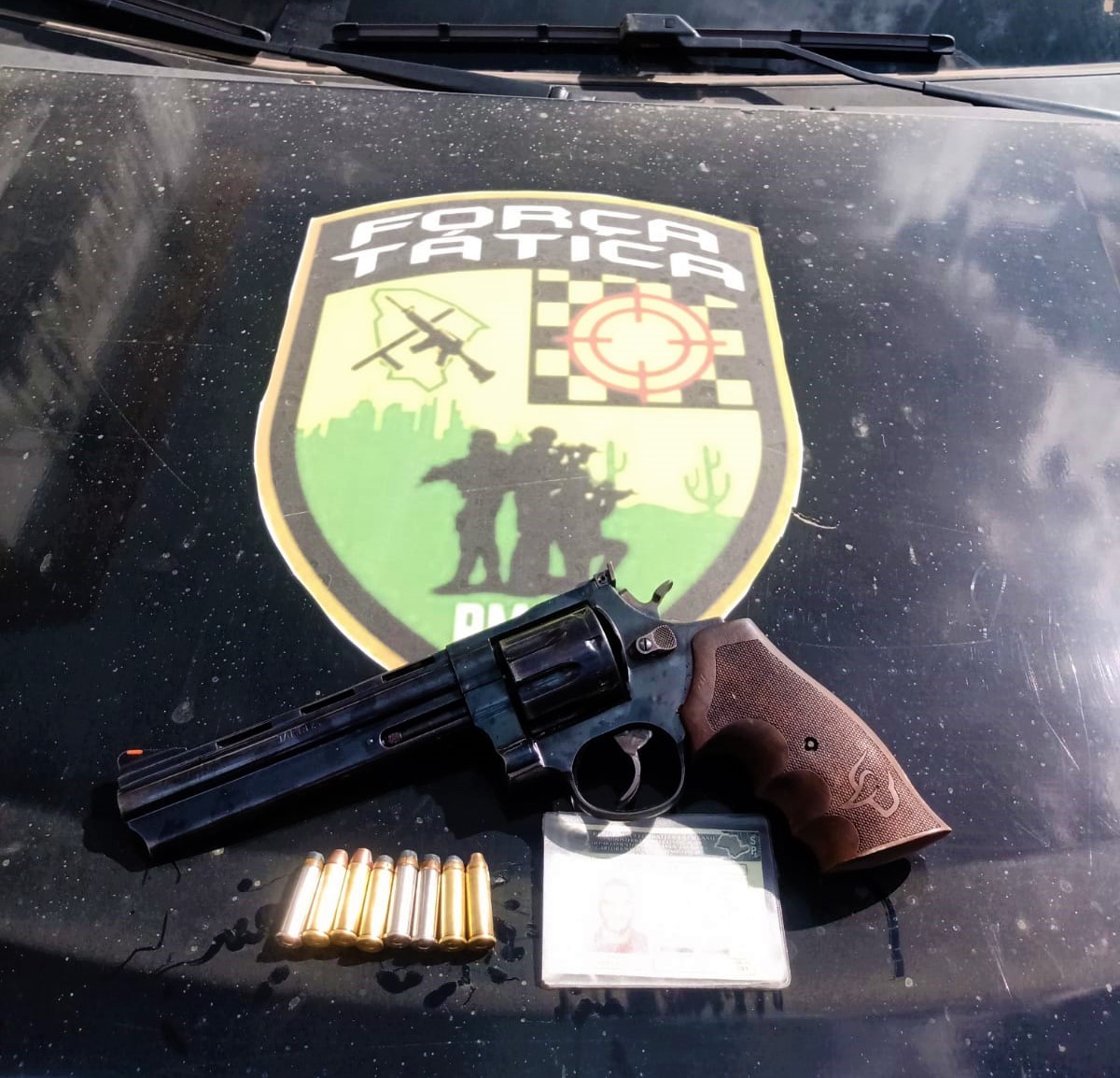 Após uma busca minuciosa no veículo foi encontrado um revólver calibre 38, capacidade para 8 munições, com todas intactas e a numeração sumprimida.