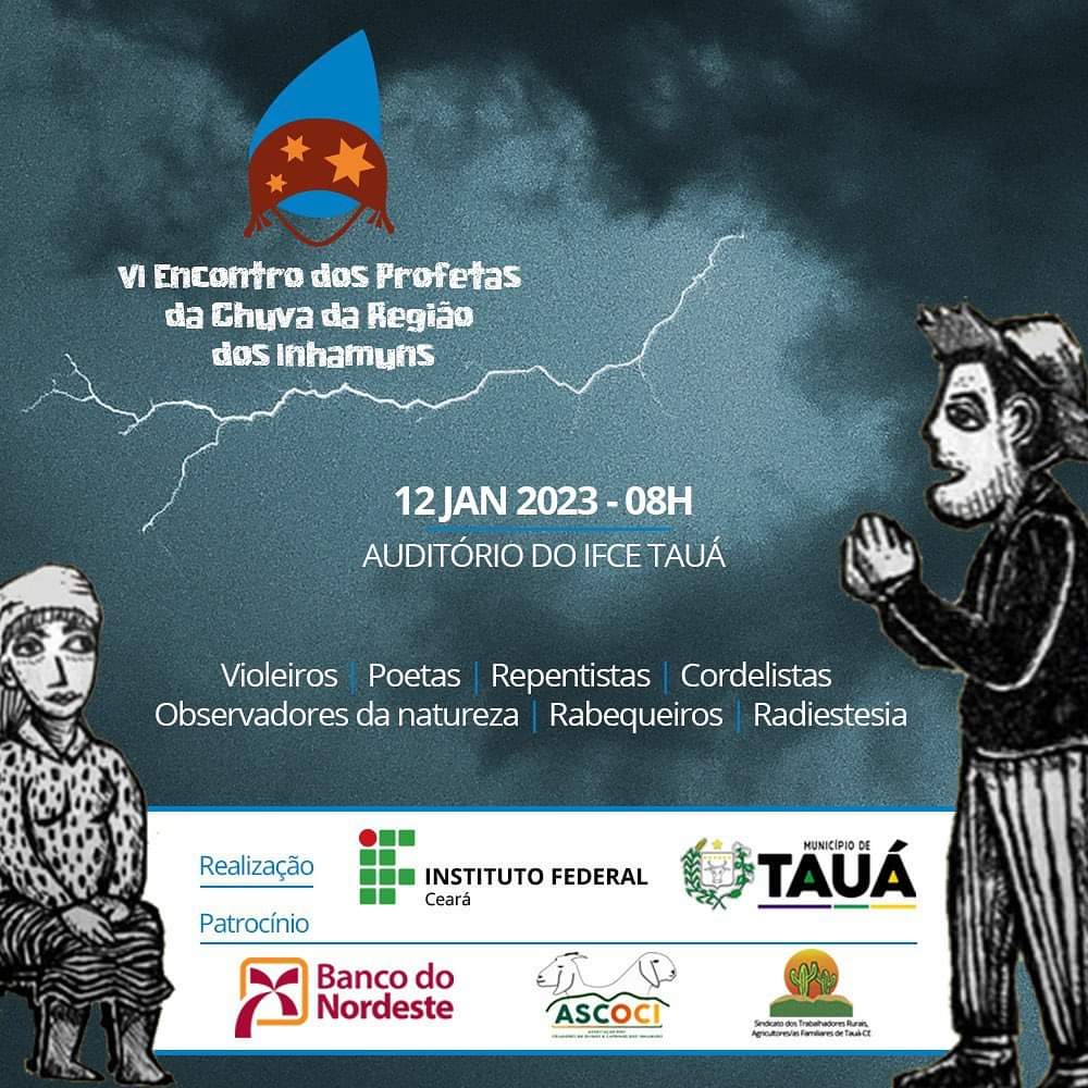 A quadra invernosa do Ceará está para começar e, com ela, vem aí o VI Encontro dos Profetas da Chuva dos Inhamuns. O tradicional evento organizado pelos campi de Boa Viagem e Tauá será realizado em parceria com a Prefeitura Municipal de Tauá na próxima quinta-feira, dia 12 de janeiro, e trará, na programação, a presença de conhecidos observadores da natureza da região e de artistas populares, como violeiros, poetas, repentistas, cordelistas e rabequeiros.
