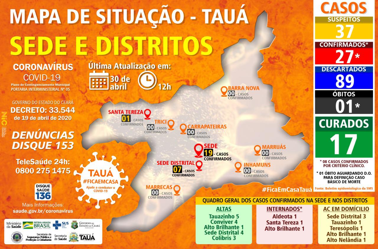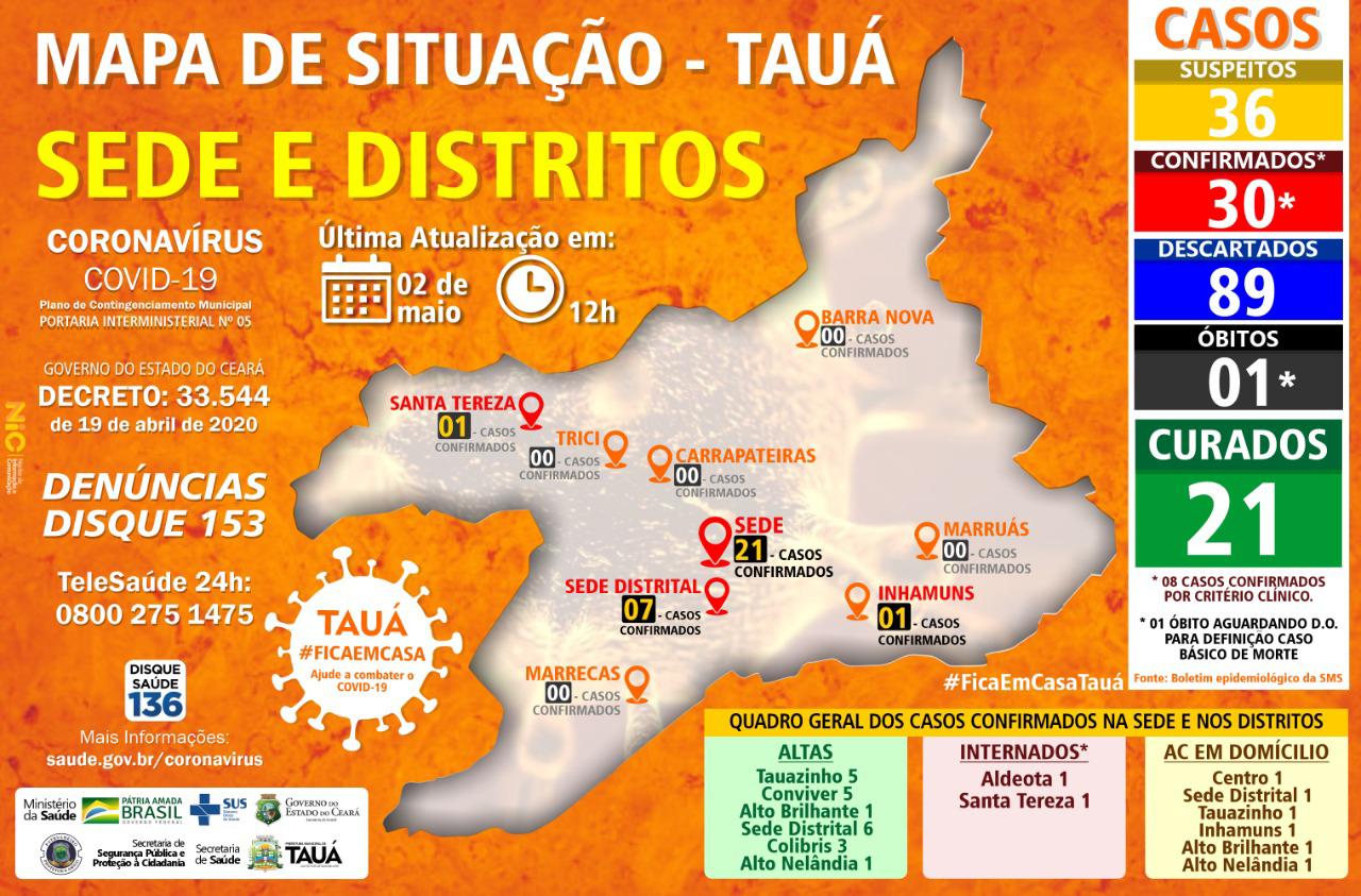 A Prefeitura Municipal de Tauá através da Secretaria de Saúde informa a situação epidemiológica do COVID-19 no nosso território. Segundo consta até a data de hoje, 02 de maio de 2020, há: