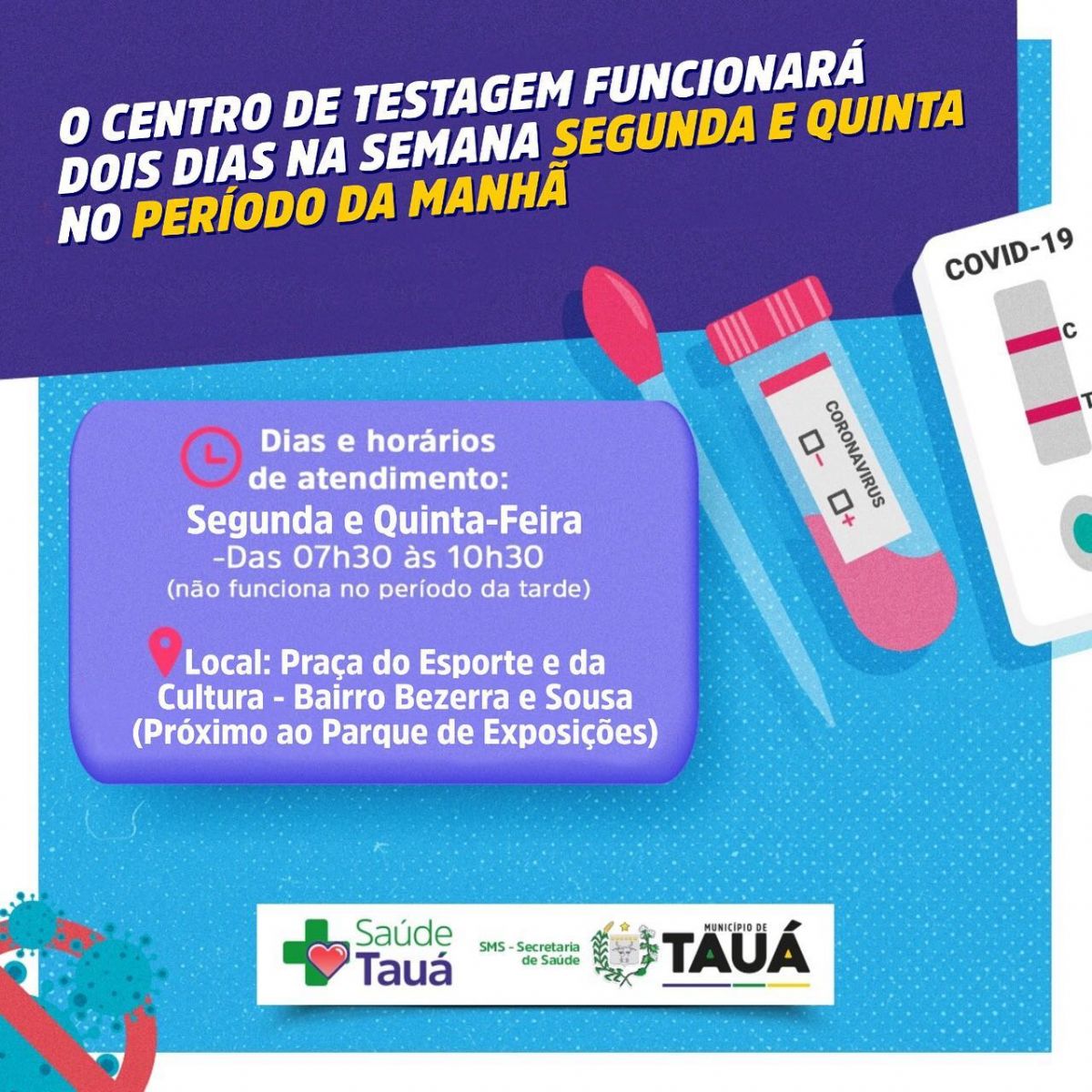 O Centro de Testagem contra a Covid passa a funcionar duas vezes por semana, às segundas e quintas-feiras, nos horário de 7:30h às 10:30h, na Praça PEC, situada no Bairro Bezerra e Sousa.