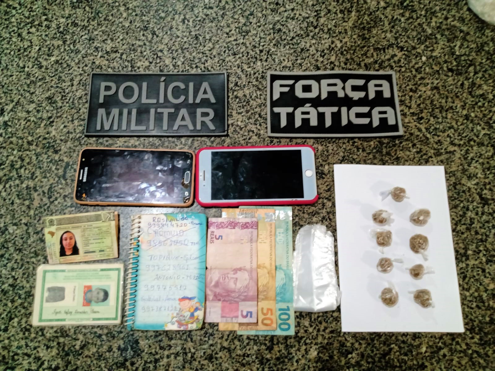 As composições da Força Tática e do POG receberam uma denúncia sobre movimentação estranha no local, típica de comercialização de drogas. Quando as equipes chegaram no imóvel logo confirmaram a informação, pois um dos ocupantes do imóvel, o Ryan, já com passagens pela Polícia por tráfico de drogas, descartou duas trouxinhas de maconha e saiu correndo para os fundos da casa, mas foi contido. Os policiais fizeram uma revista no imóvel e encontraram numa biqueira outra porção de maconha. Além da droga, também foram apreendidas cadernetas com anotações relacionadas ao tráfico, e uma quantia no valor de R$ 155,00. As três pessoas que estavam na residência receberam voz de prisão e foram conduzidas a Delegacia para a realização dos procedimentos.