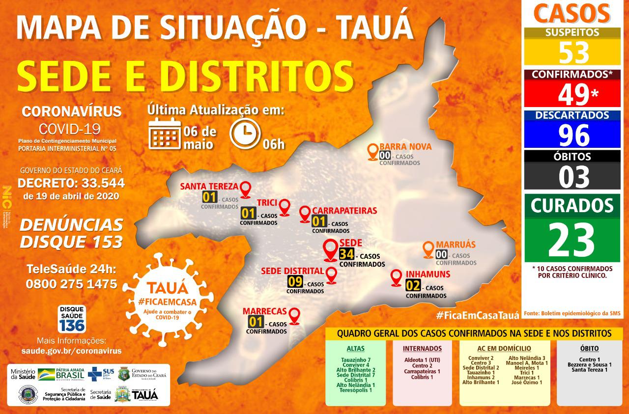 Foi divulgado na manhã de hoje(06), pela Secretaria de Saúde de Tauá um novo boletim epidemiológico atualizando a situação do Covid-19 no município. A publicação confirma o 3º óbito e aumento do número de casos confirmados na cidade e interior do município.