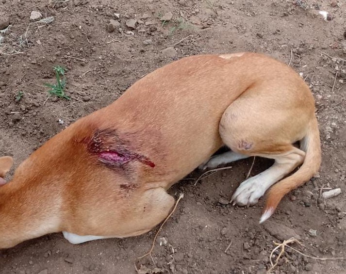 A cadela de nome "pequena" está se recuperando do ferimento nas costas.