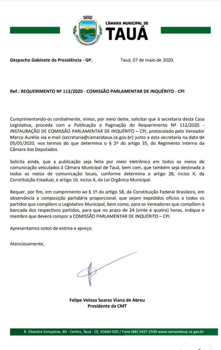 O Presidente da Câmara Municipal de Tauá, vereador Felipe Viana emitiu Despacho na tarde de hoje(07), determinando à Secretaria da Casa que realize os expedientes necessários à instalação da Comissão Parlamentar de Inquérito, solicitada por um grupo de vereadores para apurar a prática de demissões, contratações, assédio moral, concessão de gratificações, diárias e vales alimentação, no Consórcio de Saúde Pública da Região dos Inhamuns, que gerencia a Policlínica e CEO, presidido pelo prefeito de Tauá, Fred Rêgo, além de outras secretarias municipais.