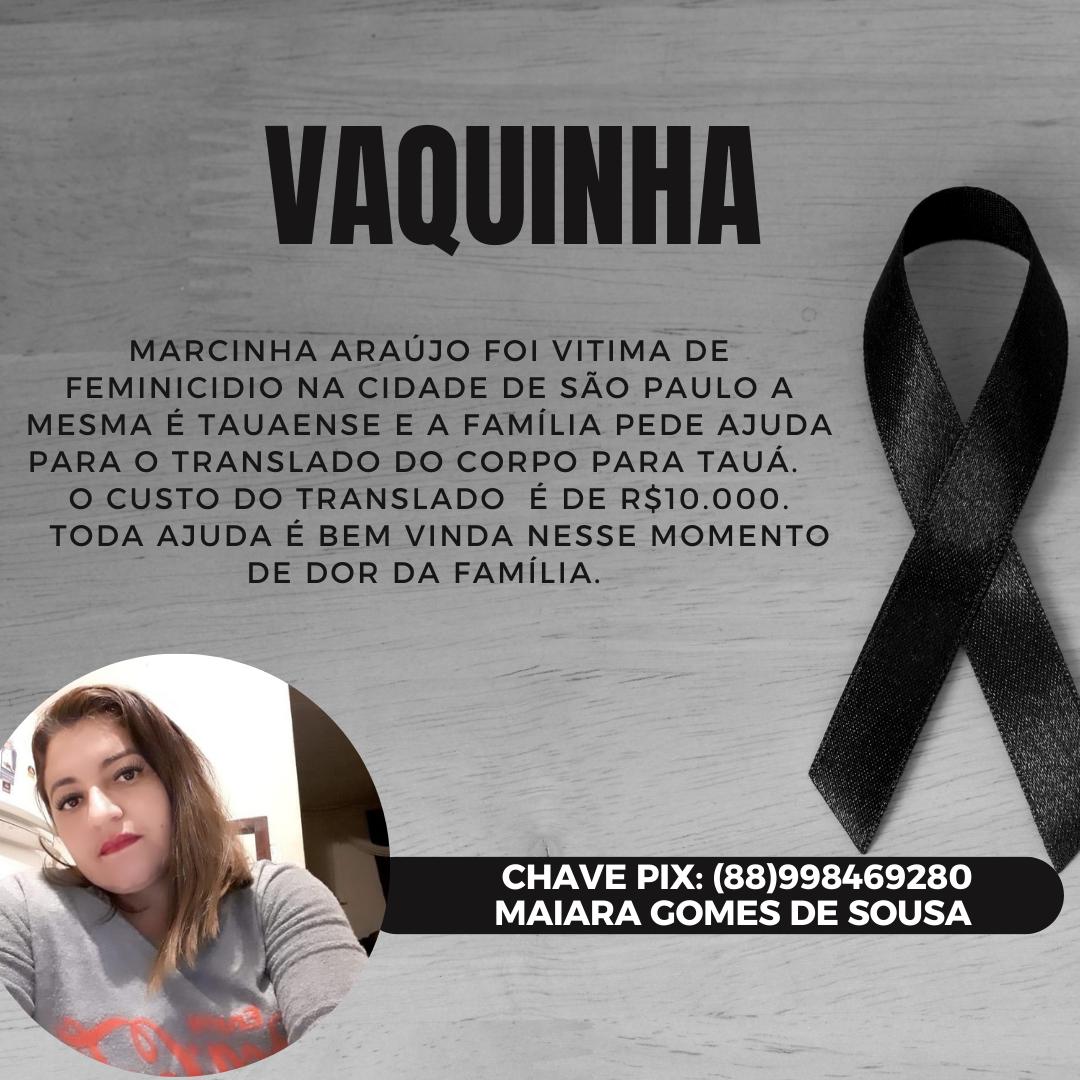 A família da tauaense Maria Márcia Araújo Loiola, 42 anos, está realizando uma campanha financeira nas redes sociais para arrecadar o valor de R$ 10 mil, para cobrir os custos com o traslado do corpo de São Paulo para sua terra natal.