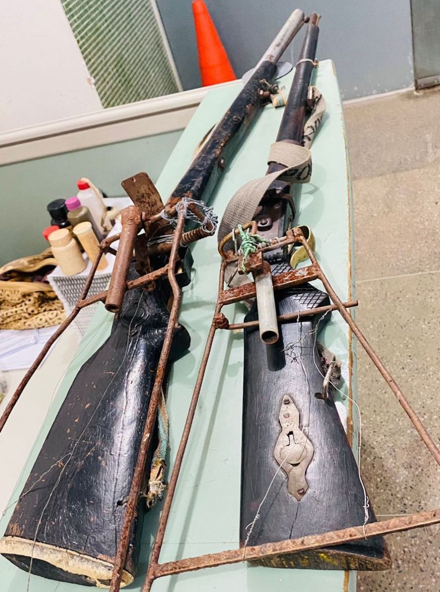 Os policiais foram ao local informado e encontraram o sr. Joaquim Romualdo de Sousa, 54 anos, que possuía duas espingardas tipo socadeiras e duas armas artesanais (conhecidas como véi macho), além de chumbo, pólvoras e espoletas.