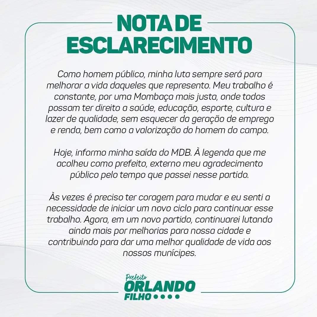 O Prefeito de Mombaça, Orlando Filho anunciou na tarde de ontem (03), por meio das redes sociais, seu desligamento do MDB, presidido no Ceará pelo Dep, Federal Eunício Oliveira.