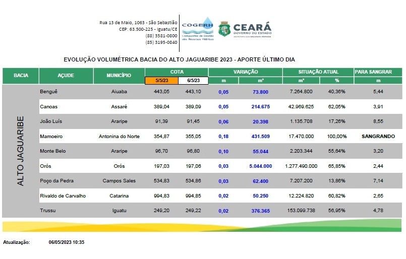 Confira o boletim da Cogerh divulgado neste sábado (06)