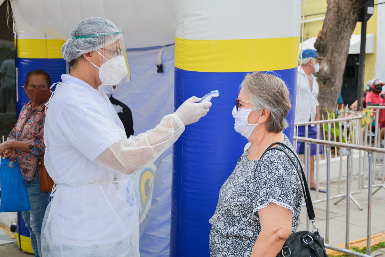 A Secretaria de Saúde de Mombaça deu início ao trabalho de aferição de temperatura e saturação de pessoas que aguardam atendimento na fila do banco Bradesco, e ainda fazem a higienização das mãos dos usuários da rede bancária. A ação compõe o pacote de medidas para conter o avanço do novo Coronavírus em Mombaça.