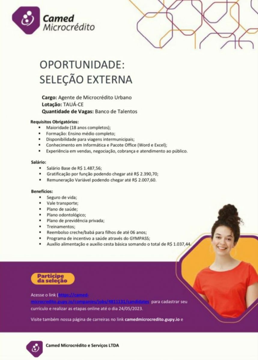 A Camed Microcrédito responsável pela operacionalização do Crediamigo do Banco do Nordeste realiza seleção para o Banco de Talentos na Unidade de Tauá.
