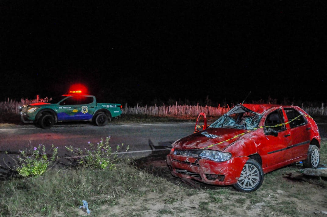 Já por volta de 23h do último sábado (20), o jovem Antônio Wagner Nogueira Mendes Filho, 22 anos, residente no município de Mombaça, morreu em um capotamento de um Fiat Pálio, cor vermelha, placas ORU 6346-Mombaça/CE, na CE-168, a 4km da vila de Marruás, na zona rural de Tauá.O SAMU foi acionado e constatou o óbito. Uma jovem identificada apenas como Júlia, sofreu uma fratura na perna e foi socorrida para o Hospital em uma ambulância do município de Mombaça. Outras 3 pessoas que estavam no carro não se feriram com gravidade. O corpo do jovem Antônio Wagner deu entrada no IML de Tauá para realização de necropsia. A ocorrência foi atendida pelos agentes do Prócidadania que permaneceram no local até a chegada da Perícia Forense.
