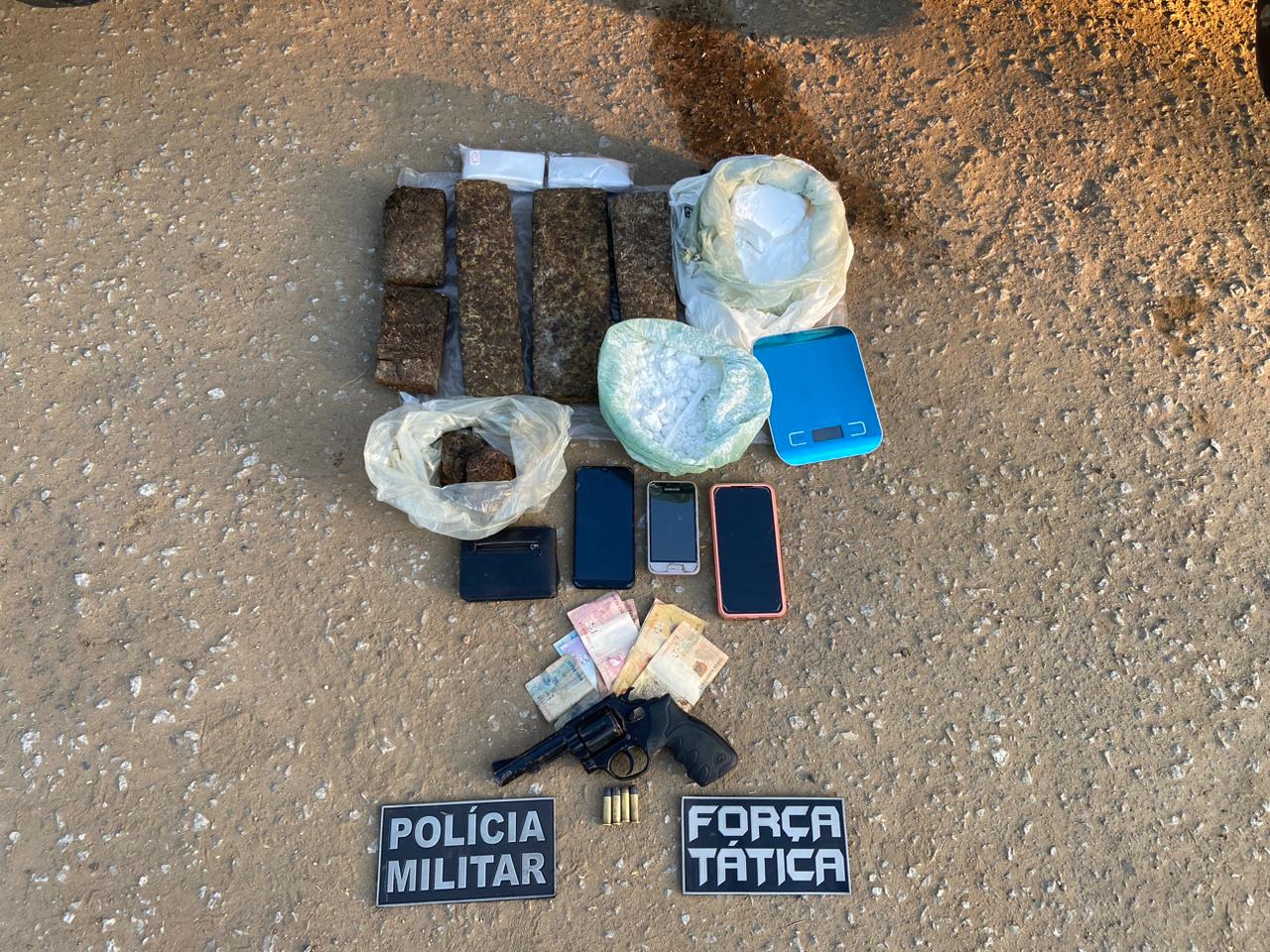 Foram apreendidos, 1 Revólver calibre 38 com 4 munições intactas, 1,72 kg de cocaína, 2,51 kg de maconha, balança de precisão, R$ 113,50 em dinheiro, 2 pacotes de saco de dindin e 3 aparelhos celulares.