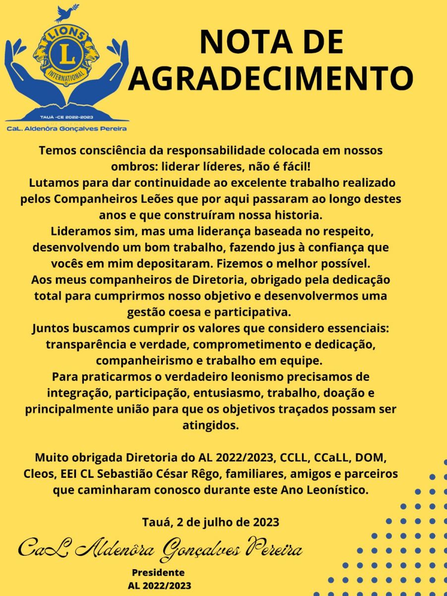 Ao encerrar seu mandato, a professora Aldenôra divulgou Nota de Agradecimento.